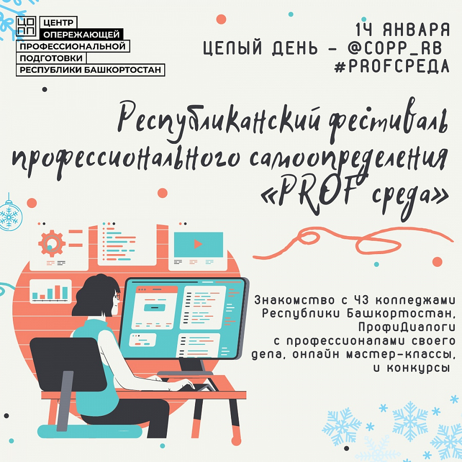 14 января Министерство образования и науки РБ и ГАУ ДПО "Центр опережающей профессиональной подготовки Республики Башкортостан" совместно с профессиональными образовательными организациями проводят республиканский фестиваль профессионального самоопределения "PROF среда". Фестиваль проводится в целях совершенствования системы профориентации в РБ, формирования позитивного отношения у молодёжи к рабочим профессиям, осуществления молодыми людьми их выбора с учетом интересов и склонностей. Фестиваль проходит в онлайн-формате в социальной сети ВКонтакте